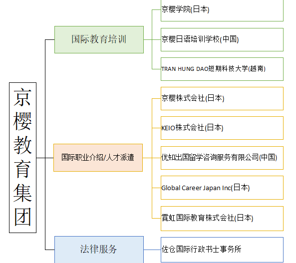 京樱教育集团,2015年2月成立于日本,是一家致力于国际集教育培训、国际职业介绍及人才派遣、房地产、法律服务等产业于一体的大型综合跨国教育集团。